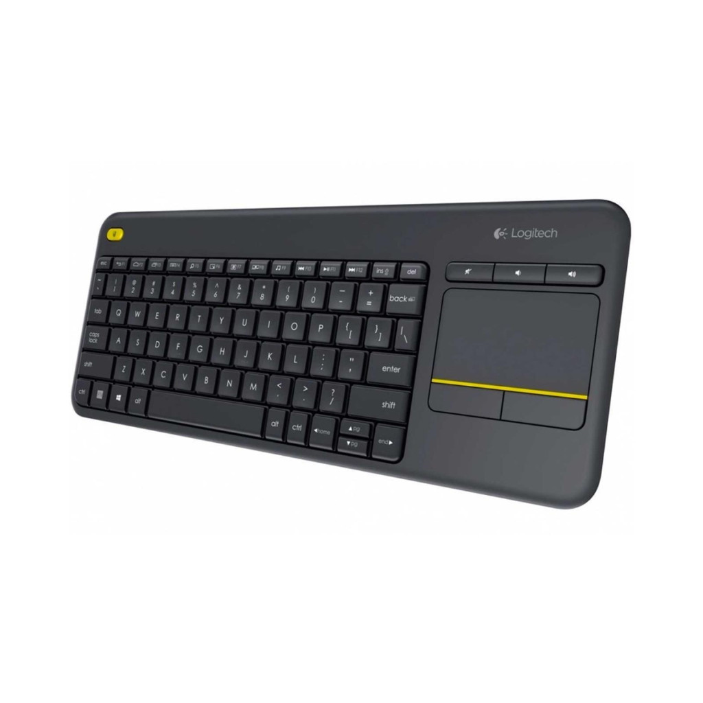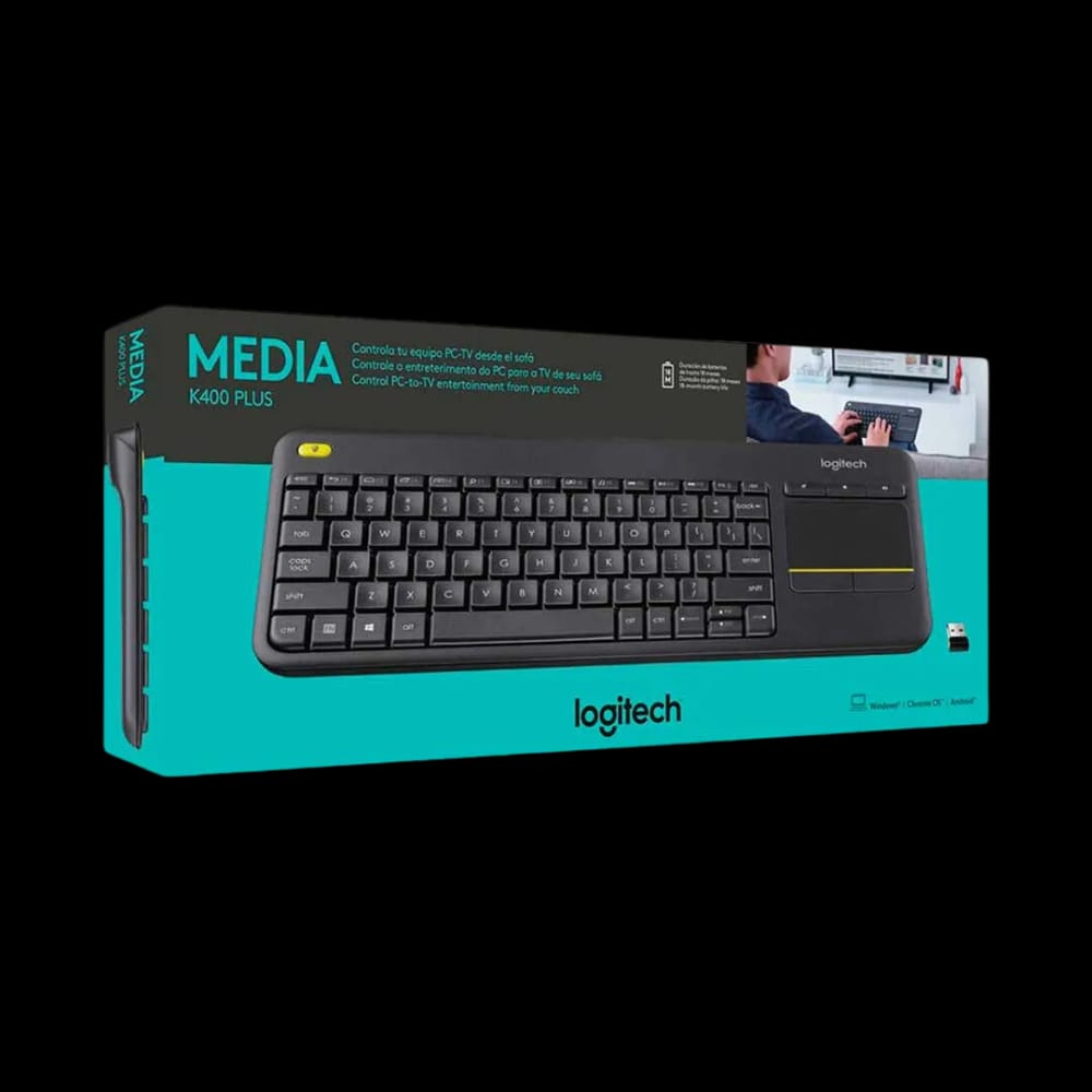 Teclado inalámbrico con touchpad integrado para controlar PCs/TVs desde el sofá. Conexión 2.4 GHz vía receptor USB Unifying, alcance hasta 10 m, teclas silenciosas, diseño resistente a derrames y hasta 18 meses de batería. Compatible con Windows, Android y ChromeOS.